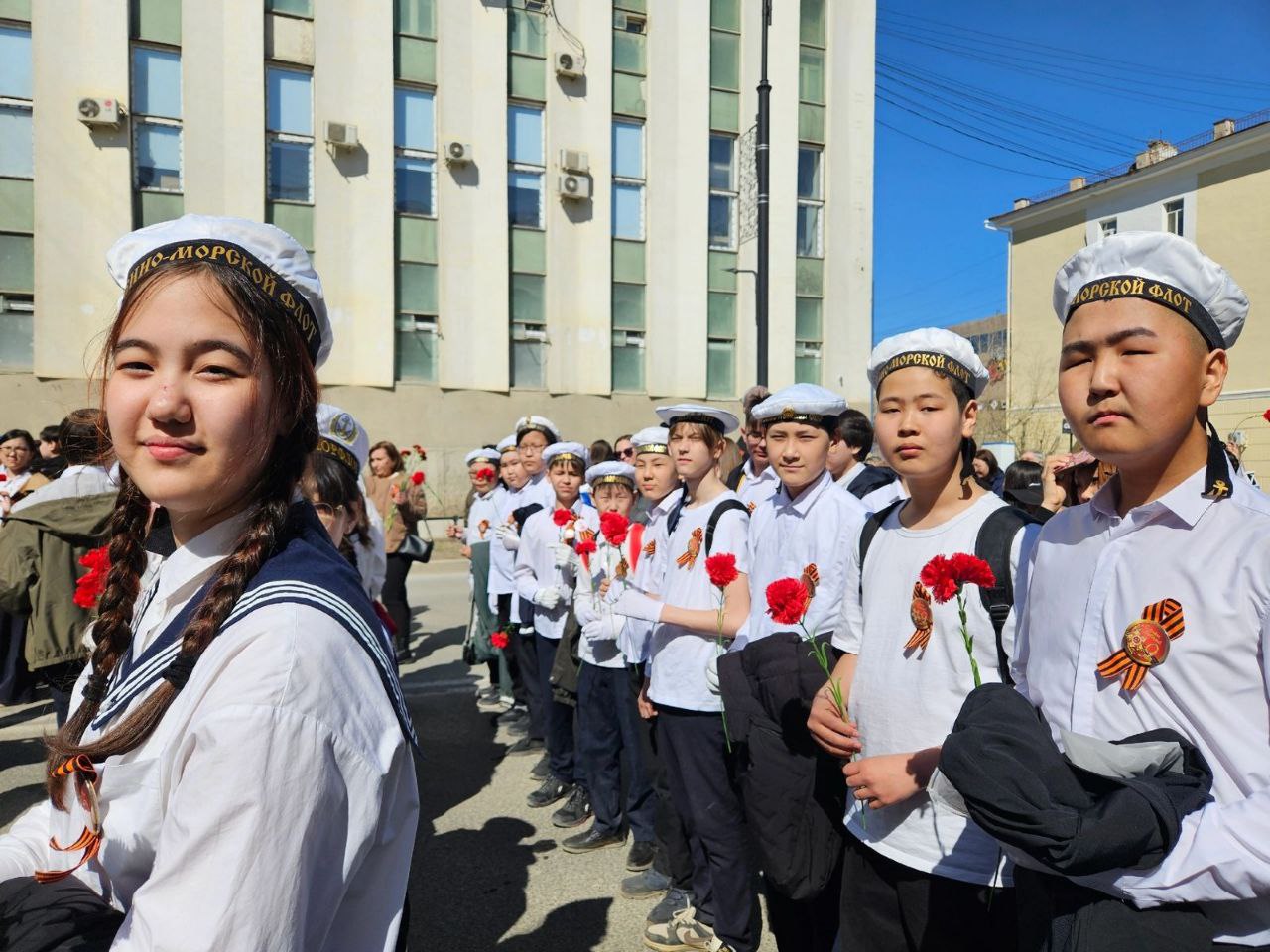 В военно-патриотическом шествии «Гордимся славою героев!» приняли участие школьники, педагоги и родители общеобразовательных школ города Якутска, носящих имена героев Великой Отечественной войны, тыла и труда.