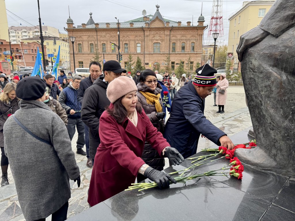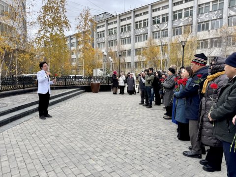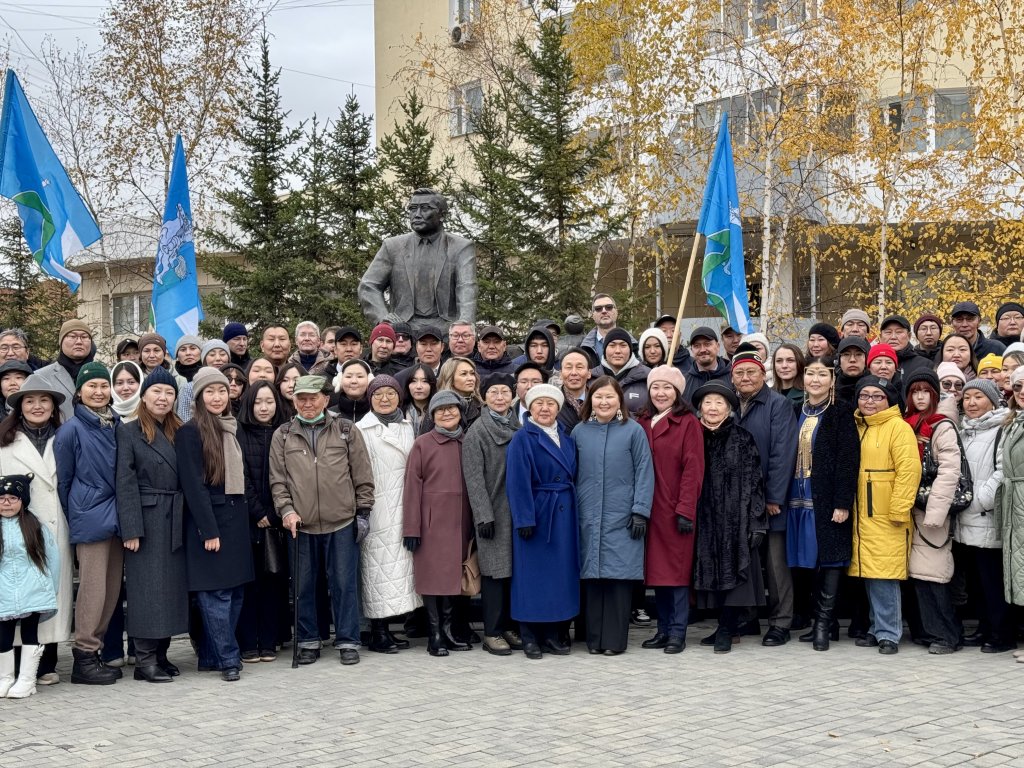 Начальник Управления образования городского округа г. Якутск Мария Петрова, представители управления образования и образовательных учреждений города, педагогическая общественность и школьники возложили цветы к памятнику академика Владимира Петровича Ларионова.