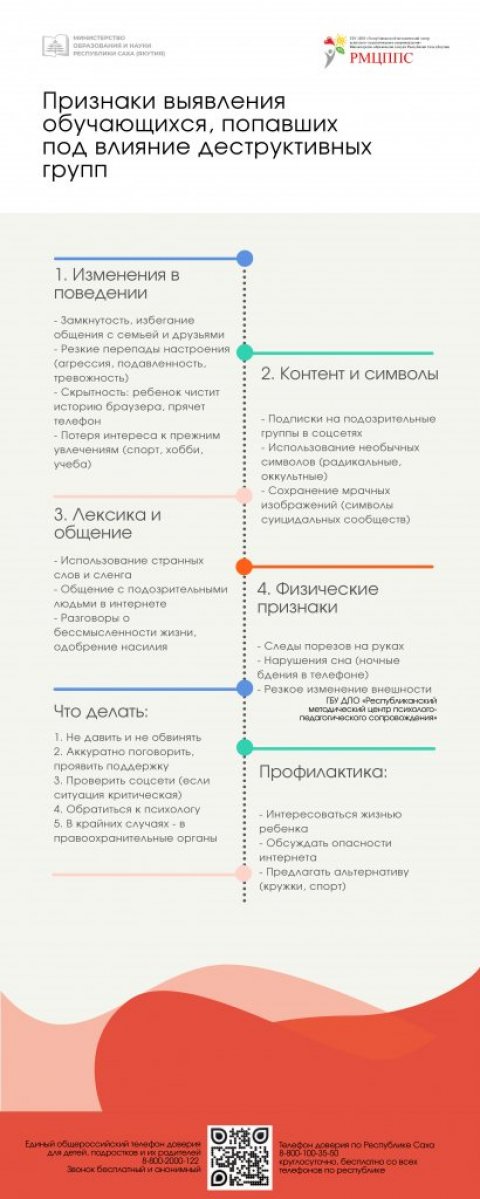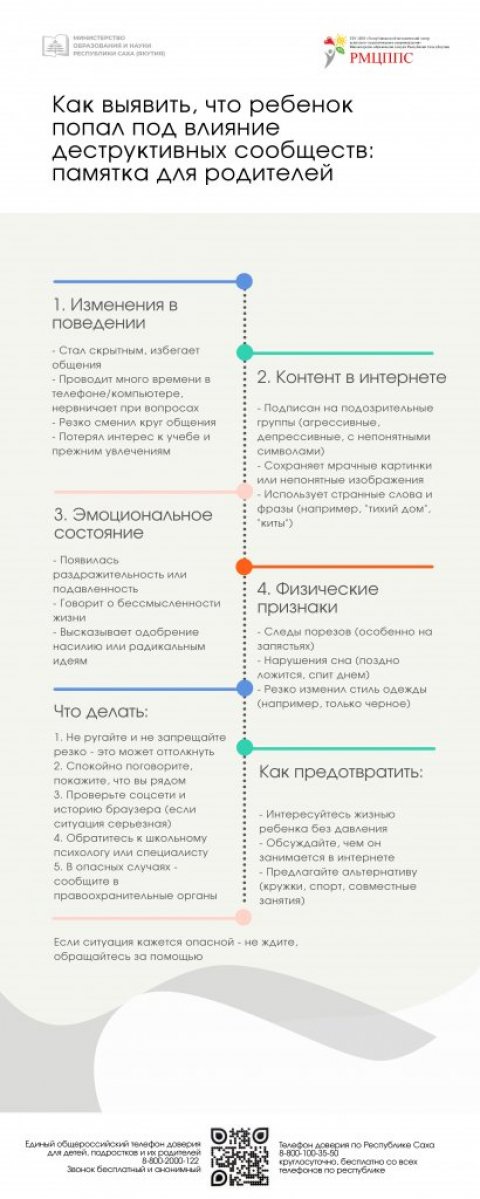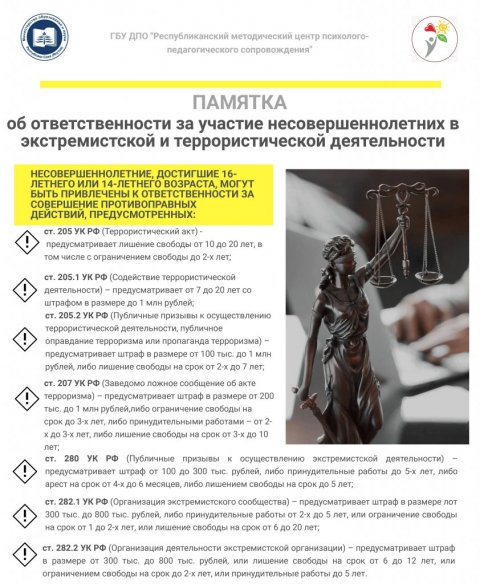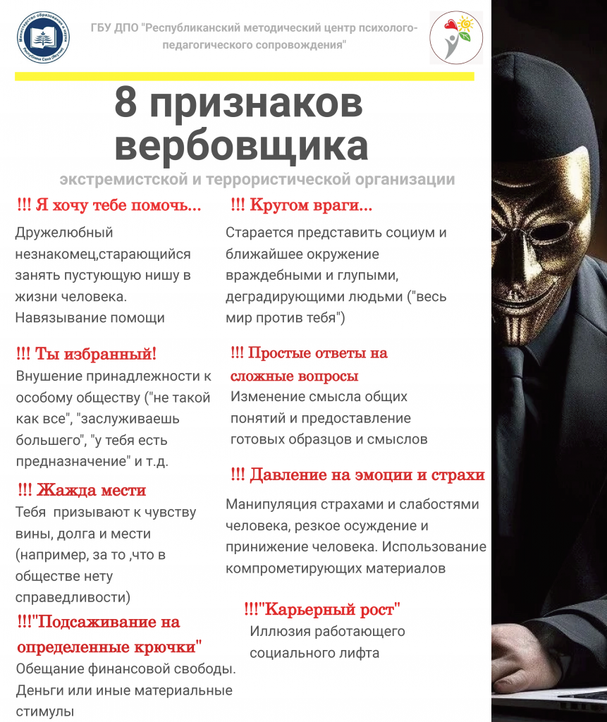 В последнее время в мессенджерах участились случаи распространения контента, вовлекающее в деятельность террористических организаций. Управление образования Окружной администрации г. Якутска призывает руководителей, педагогов и родителей усилить бдительность. Сохраните и поделитесь информационными карточками Министерства образования и науки РС(Я) и ГБУ ДПО "Республиканский методический центр психологопедагогического сопровождения".
