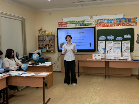 Ольга Ларионова провела с молодыми учителями урок окружающего мира в 1 классе «Где живет белый медведь?». Участники семинара погрузились в творческую атмосферу, работали с текстом, физической картой мира, помогли животным найти свой дом.