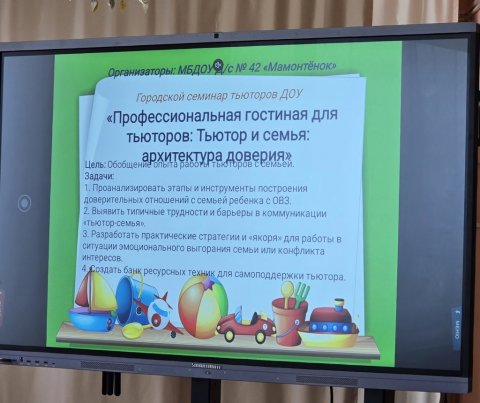 26 февраля на базе детского сада №42 «Мамонтенок» прошел городской семинар тьюторов «Профессиональная гостиная: тьютор и семья – архитектура доверия». В семинаре приняли участие 26 педагогов: тьюторы городских детских садов, воспитатели и педагоги д/с «Мамонтенок».