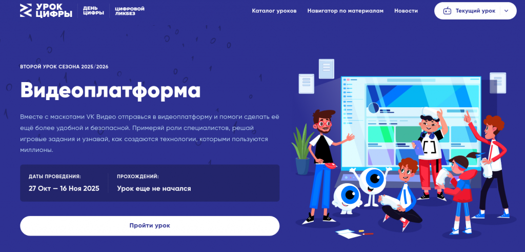 С 27 октября по 16 ноября VK проводит новый этап всероссийского проекта «Урок цифры» на тему «Видеоплатформа». Школьники узнают, как устроен современный сервис хранения и распространения видео на примере крупнейшей платформы VK Видео. Проект ежегодно реализуется АНО «Цифровая экономика» совместно с Минцифры и Минпросвещения России в поддержку федерального проекта «Кадры для цифровой трансформации» национального проекта «Экономика данных и цифровая трансформация государства», а также национальной цели «Технологическое лидерство».