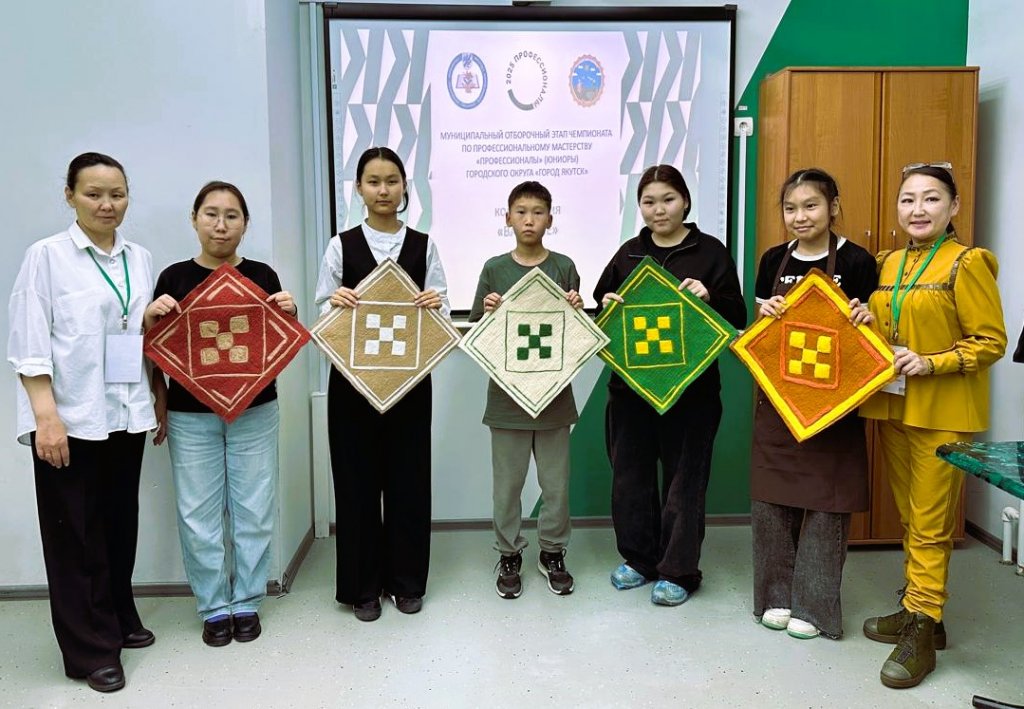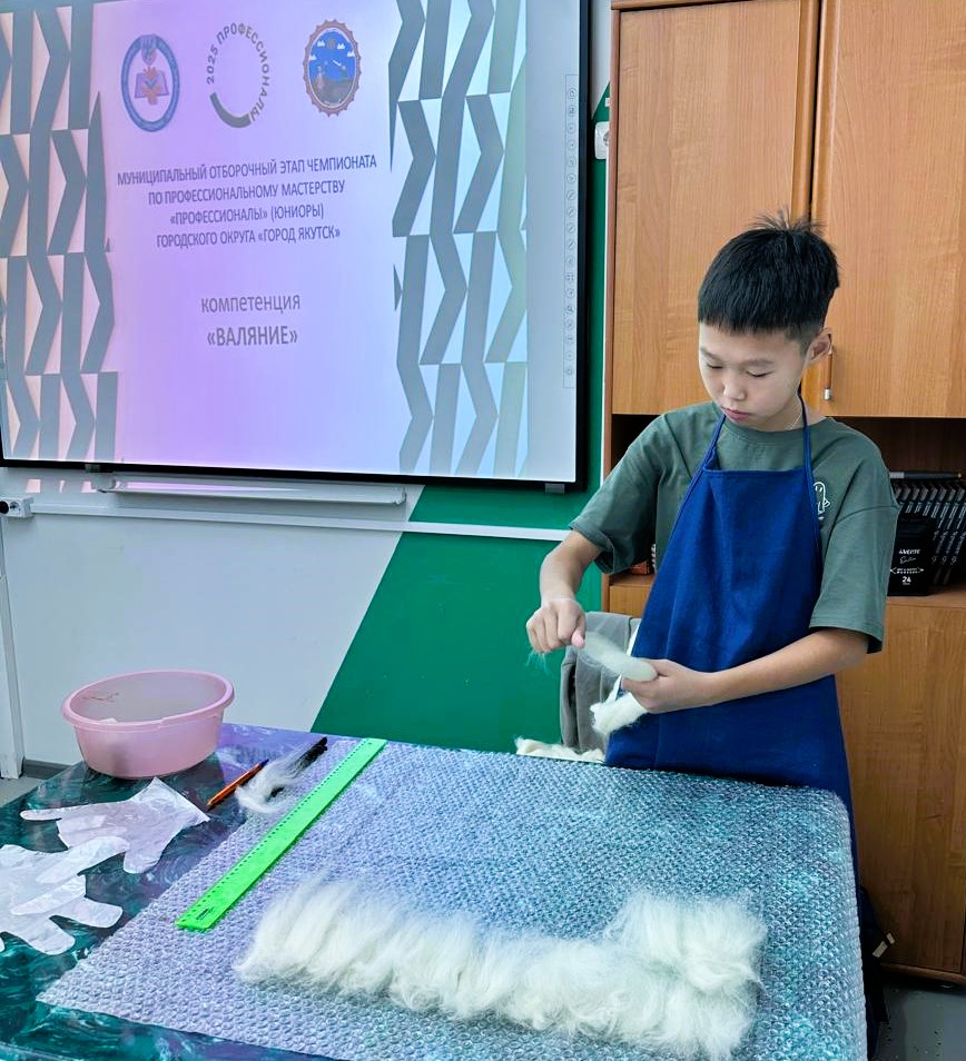 Задание состояло из нескольких этапов: раскладка шерсти, процесс валяния основы, нанесение орнамента. В чемпионате приняли участие талантливые школьники: Саргыдаев Айсен (СОШ №31), Иванова Любовь (Хатасская СОШ имени П.Н. и Н.Е. Самсоновых), Сидорова Диана (СОШ №39 имени Н.И. Шарина), Саввинова Диана (Хатасский дом творчества "Ситим"), Бурнашева Алина (СОШ №1)
