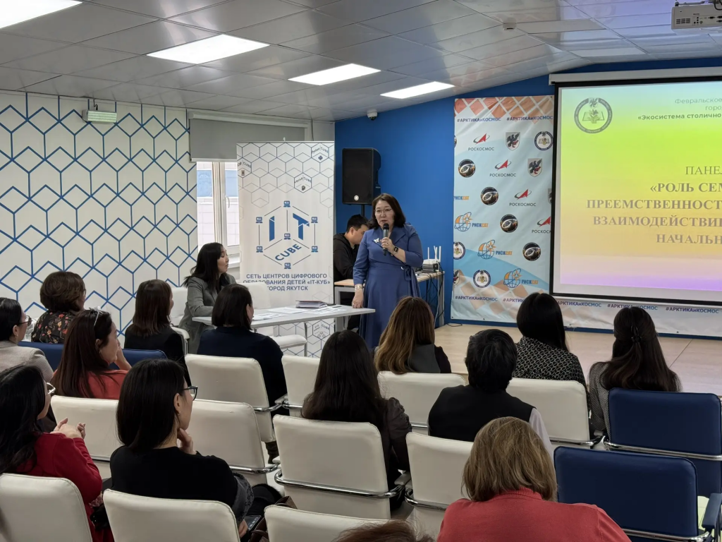 Сегодня, 11 февраля, в актовом зале Центра «IT-куб» состоялась панельная дискуссия на тему «Роль семьи в обеспечении преемственности читательского развития: взаимодействие в призме дошкольного и начального образования». Мероприятие прошло в рамках февральского совещания работников образования городского округа «город Якутск». В обсуждении, собравшем около 90 участников — родителей, воспитателей, учителей начальных классов и библиотекарей образовательных учреждений города Якутска — была затронута одна из ключевых тем педагогического сообщества: роль семьи в формировании читательских навыков у детей от дошкольного возраста до начальной школы.