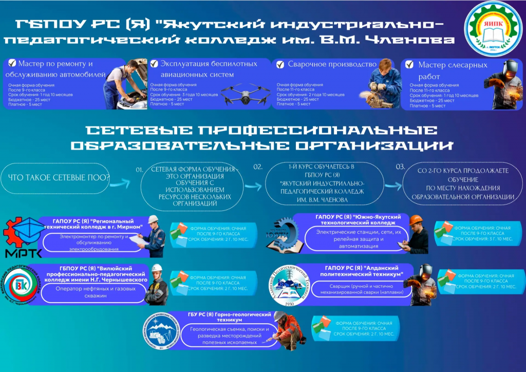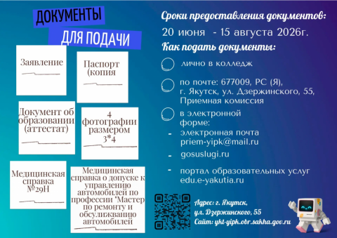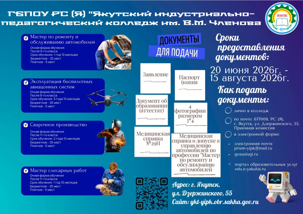 С 20 июня по 15 августа в Якутском индустриально-педагогическом колледже им. В.М. Членова открыт приём документов для поступления. Абитуриенты могут выбрать как само учебное заведение, так и сетевые профессиональные образовательные организации республики.