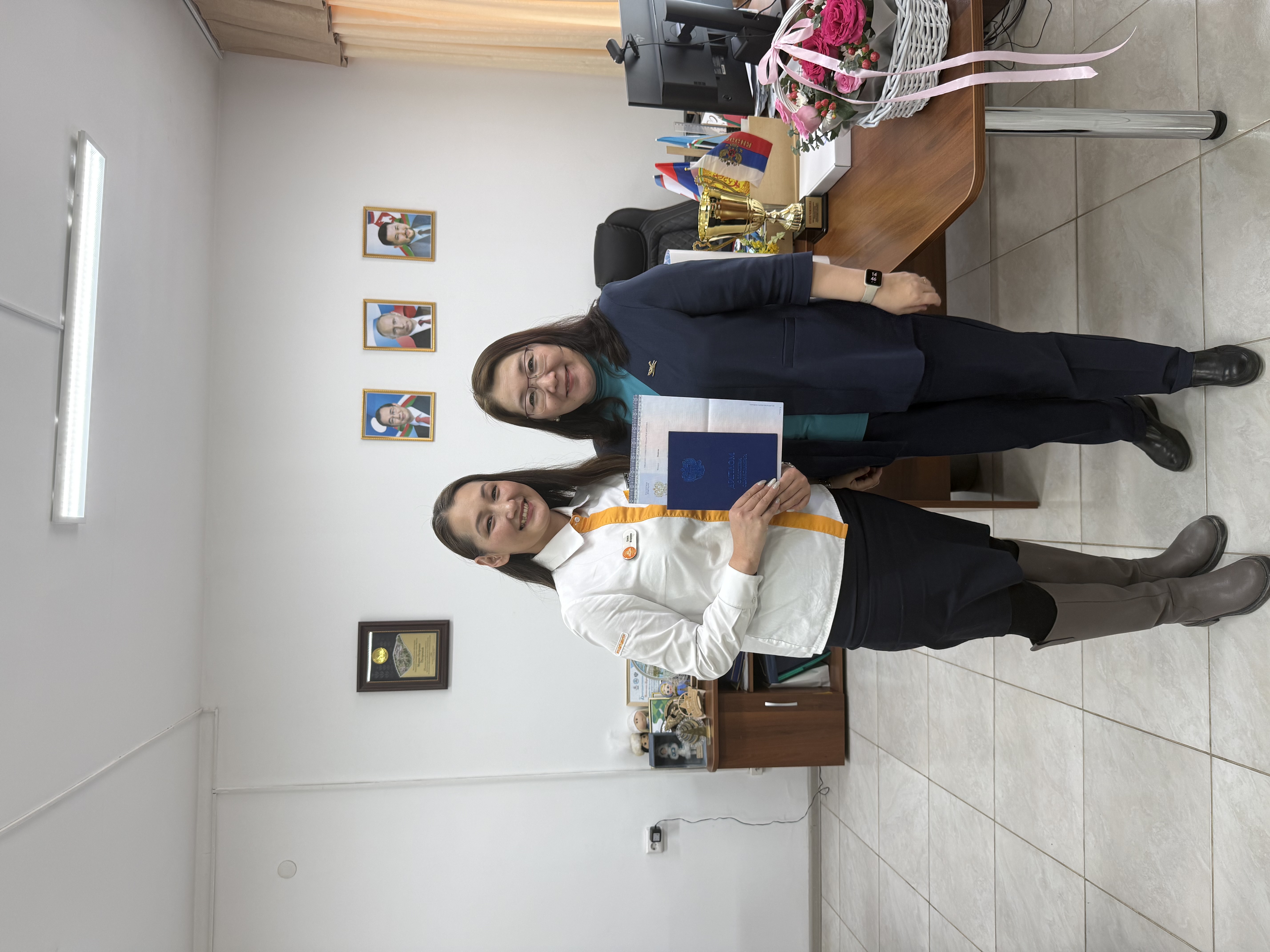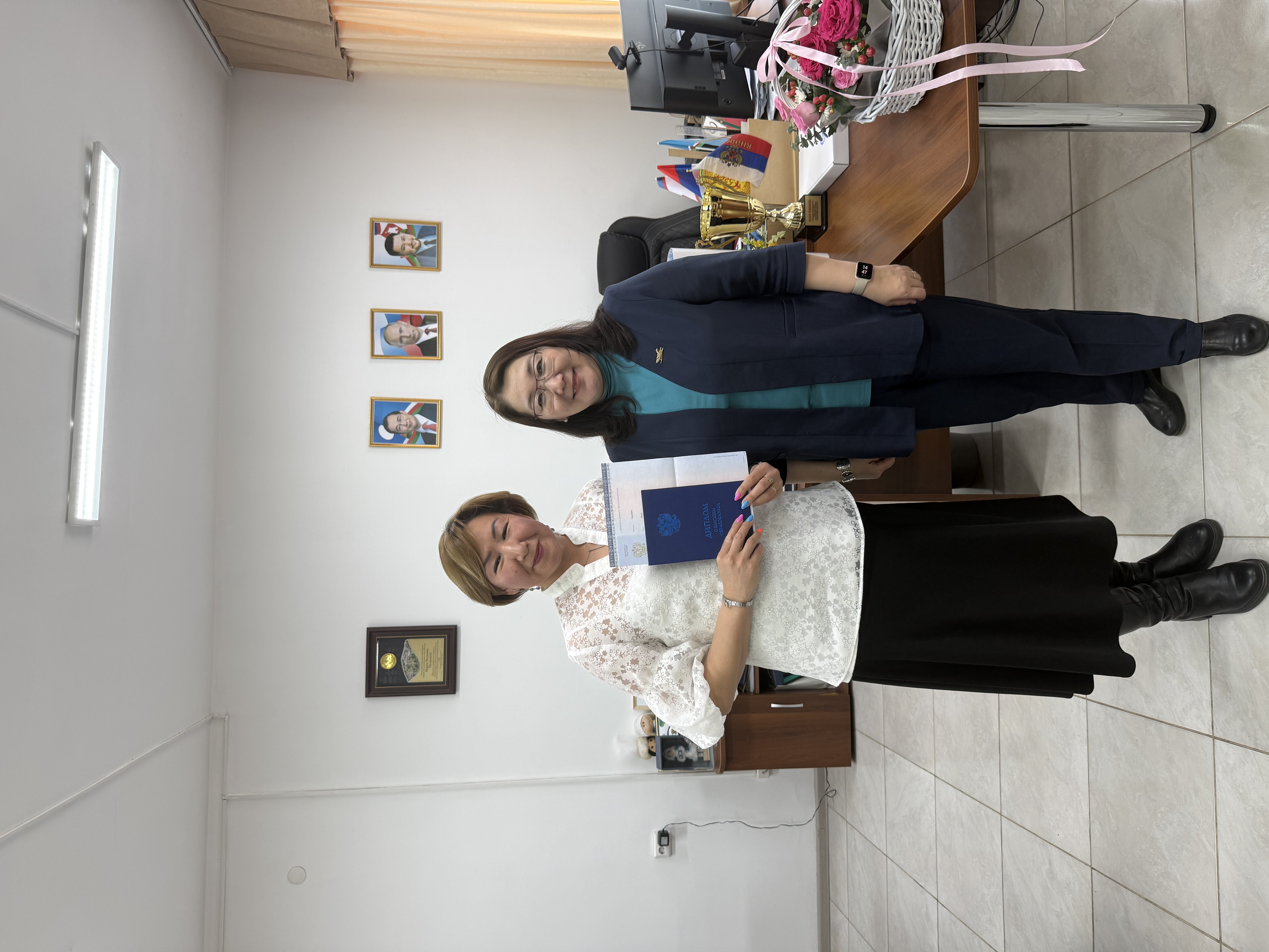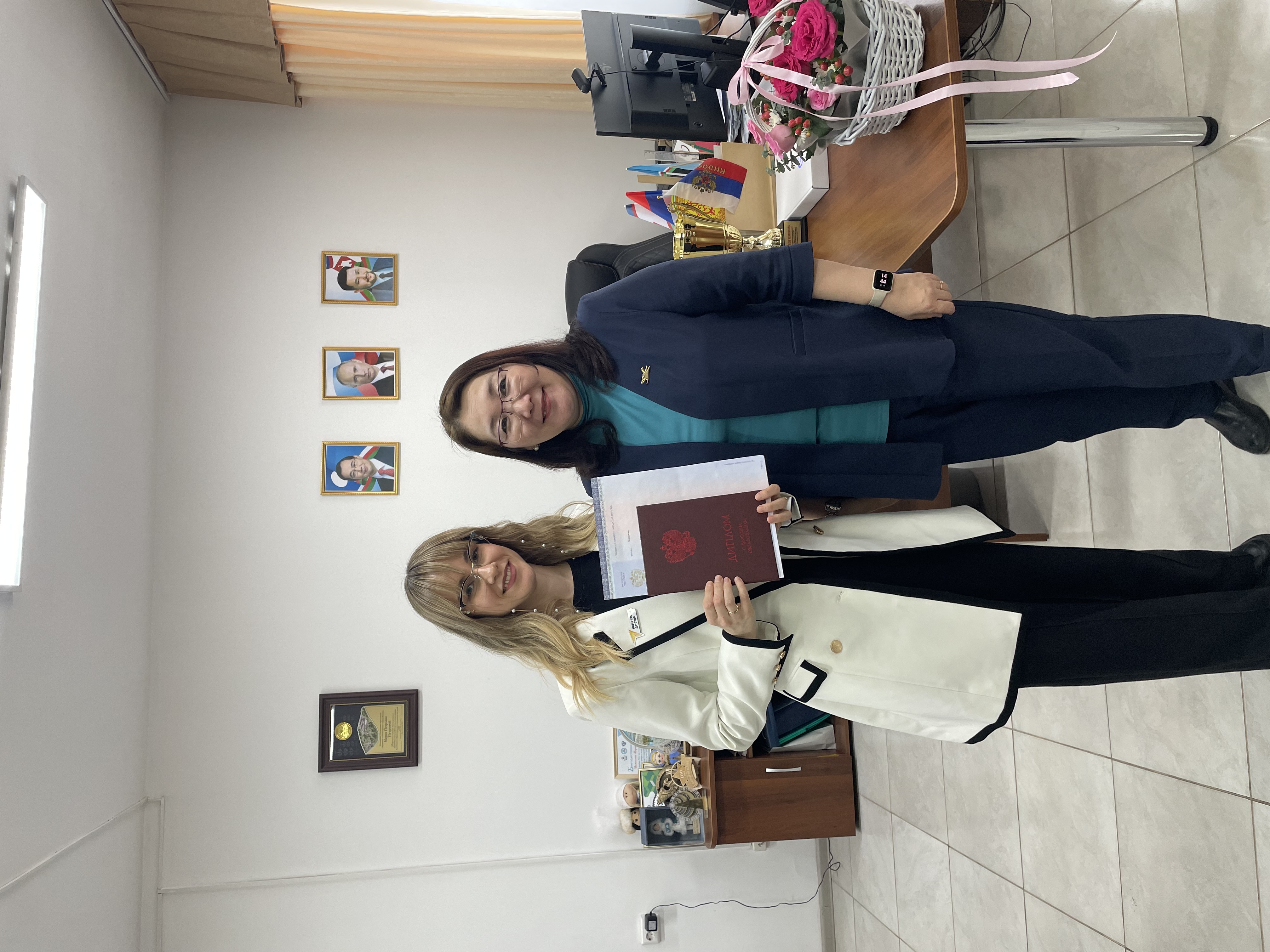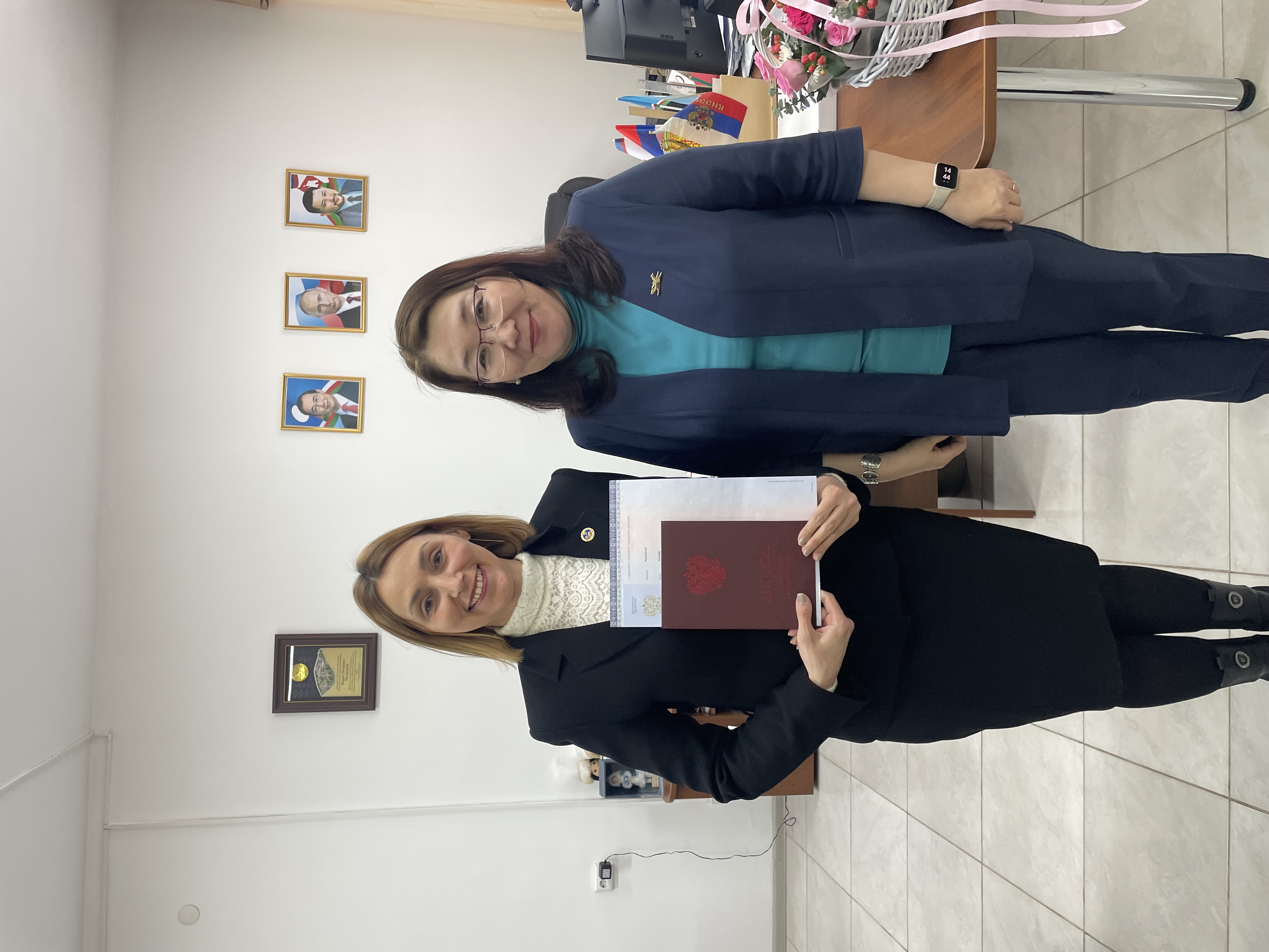 Во время встречи Мария Петровна поздравила педагогов с завершением магистратуры и присвоением степени магистра, вручив им дипломы. Она отметила, что это большое достижение — совмещать напряжённую педагогическую работу с серьёзным обучением. Этот пример показывает, как важно постоянно развиваться и не бояться новых вызовов. И пожелала, чтобы полученные знания принесли много новых идей, помогли реализовать задуманные проекты.